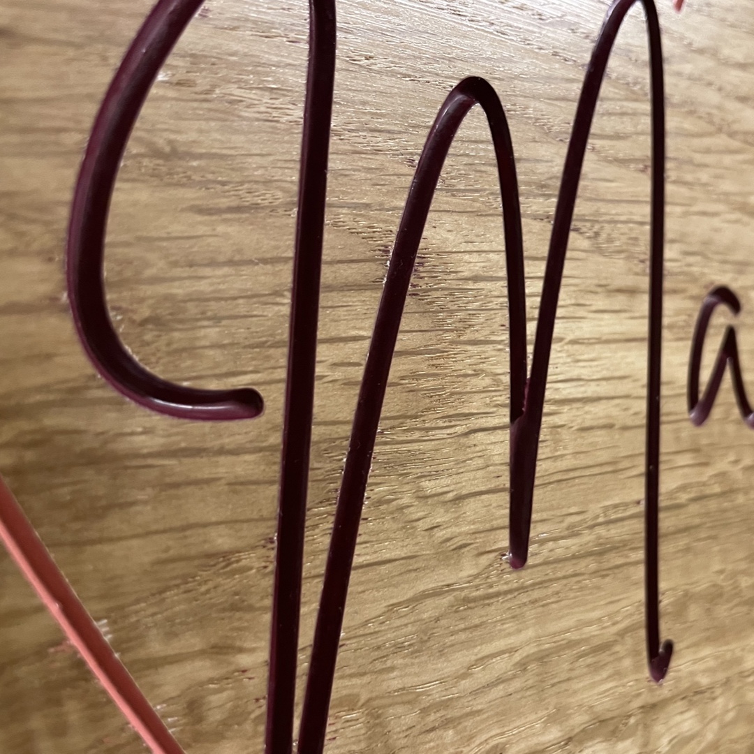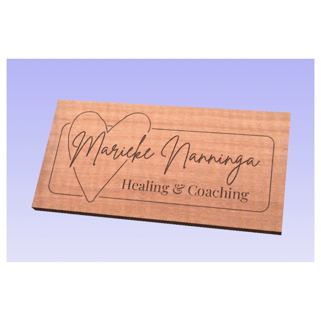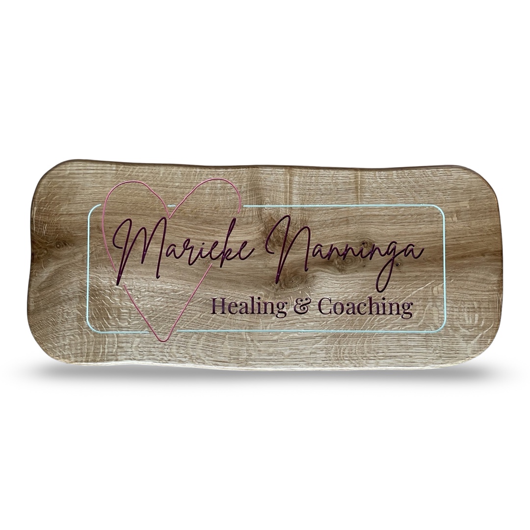 Het logo van de praktijk aangepast op een manier dat dit mooi in het massieve stuk eiken naar voren zou komen. De klant wenste een organische en speelse look die gecreëerd is door met de nerven van het hout rondom uit te zagen. De kastanje paal sloot mooi aan bij de inrichting van de rest van de tuin.