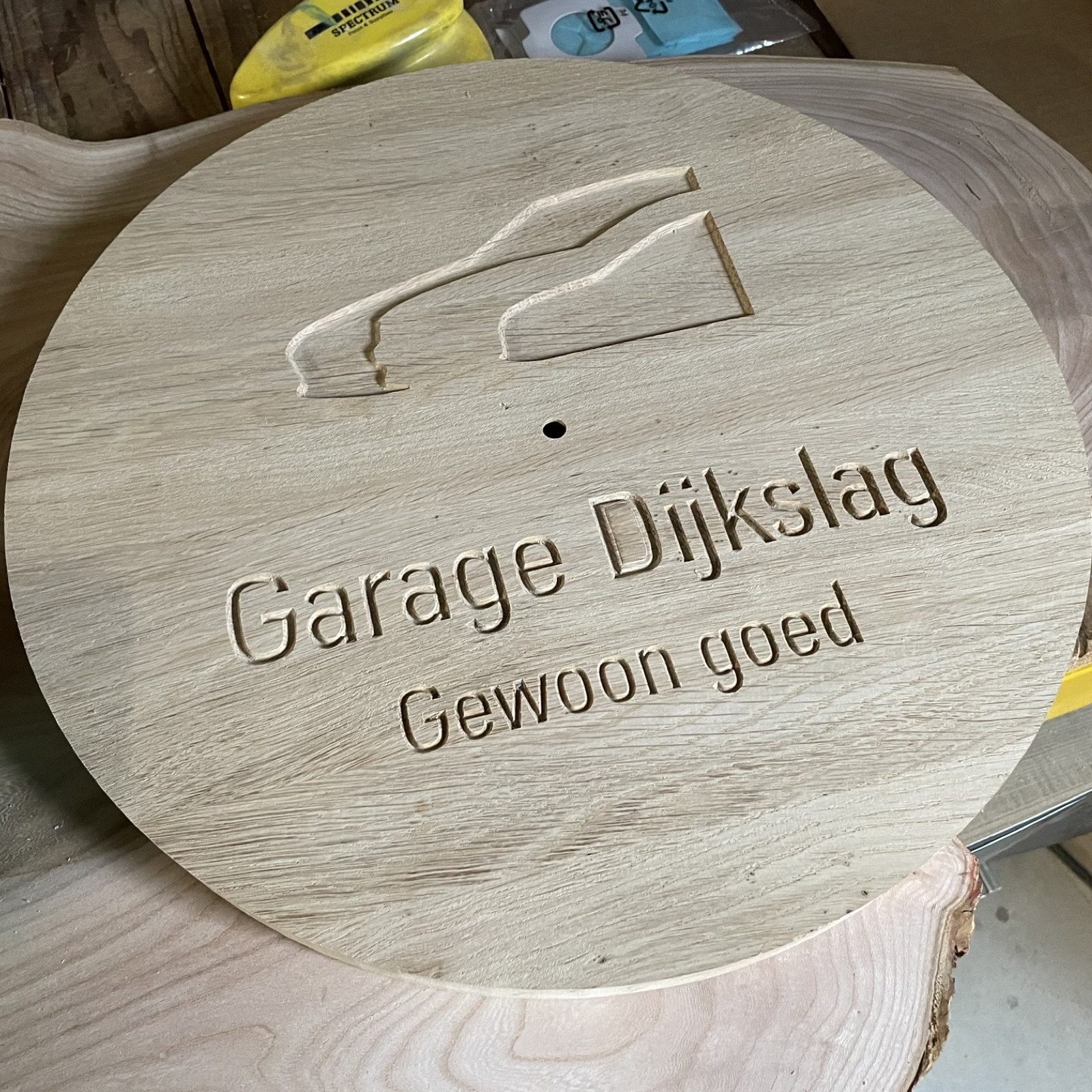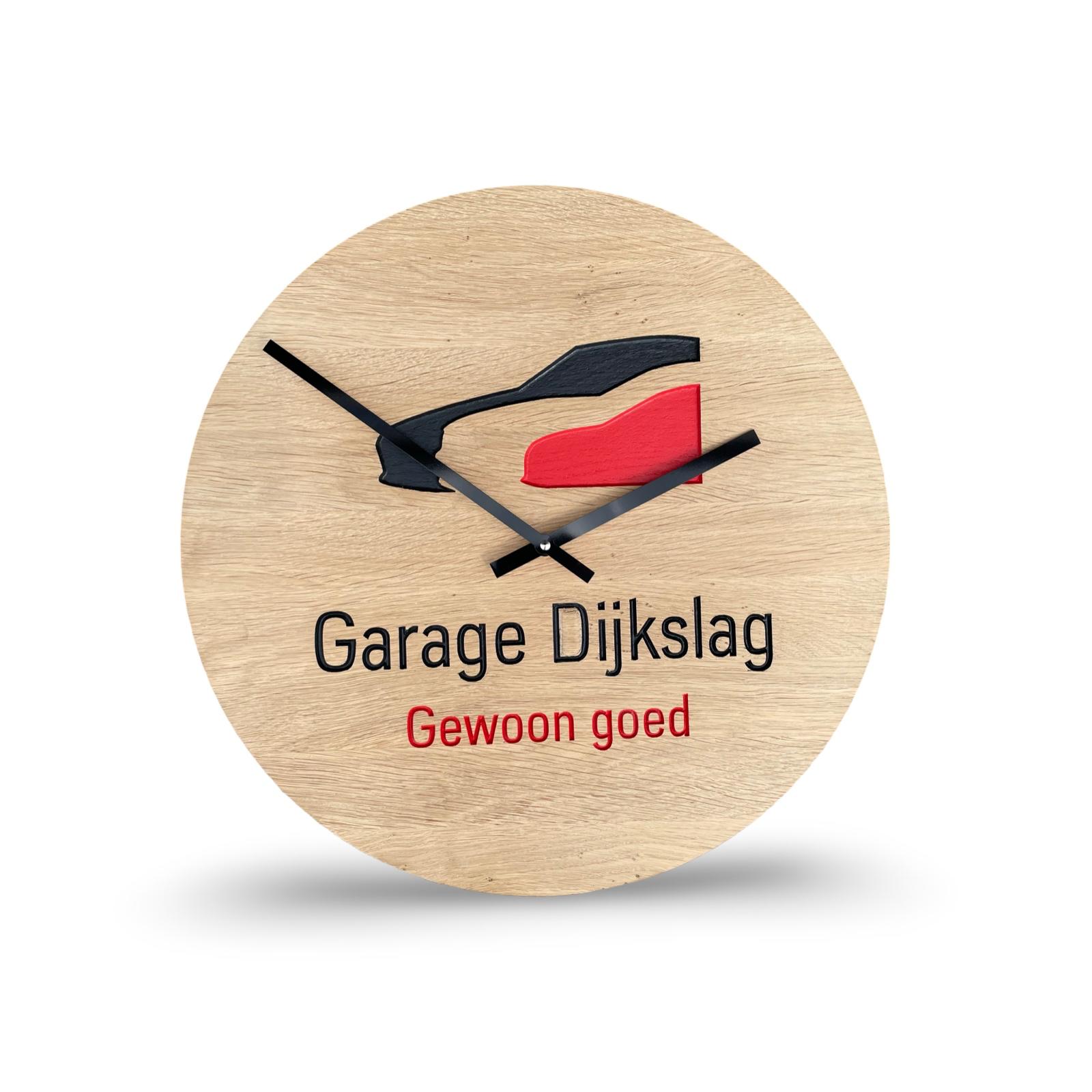 Prachtige wandklok gemaakt van eik. Uniek exemplaar voorzien van het bedrijfslogo. Oorsprong van het hout ligt in de gemeente Tynaarlo (Drenthe).