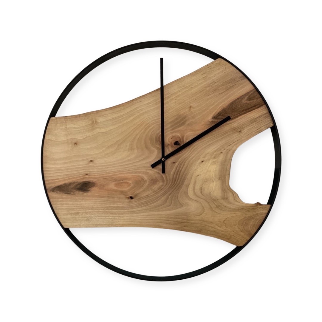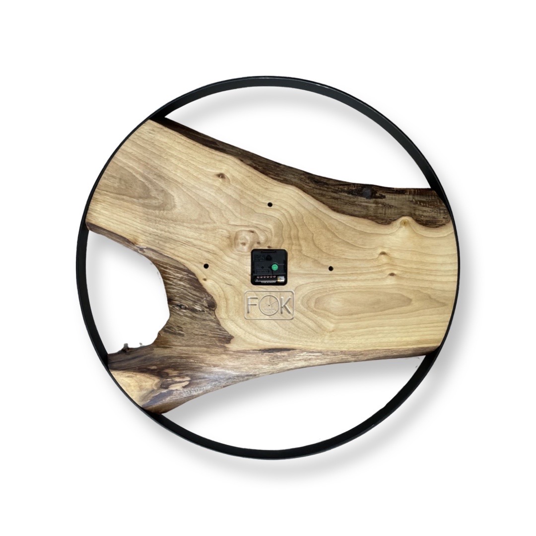 Grote wandklok van walnoot met stalen ring. Wat deze klok uniek maakt is de oorsprong van het hout en het feit dat dat de stalen ring door Hans, van Las en Montagebedrijf Horlings, met de hand perfect rond is gewalst. De prachtige tekening in het hout komt door de afwerking met Rubio Monocoat mooi naar voren.