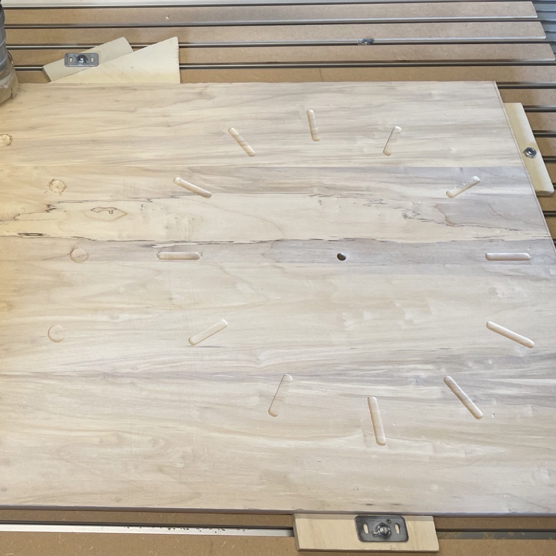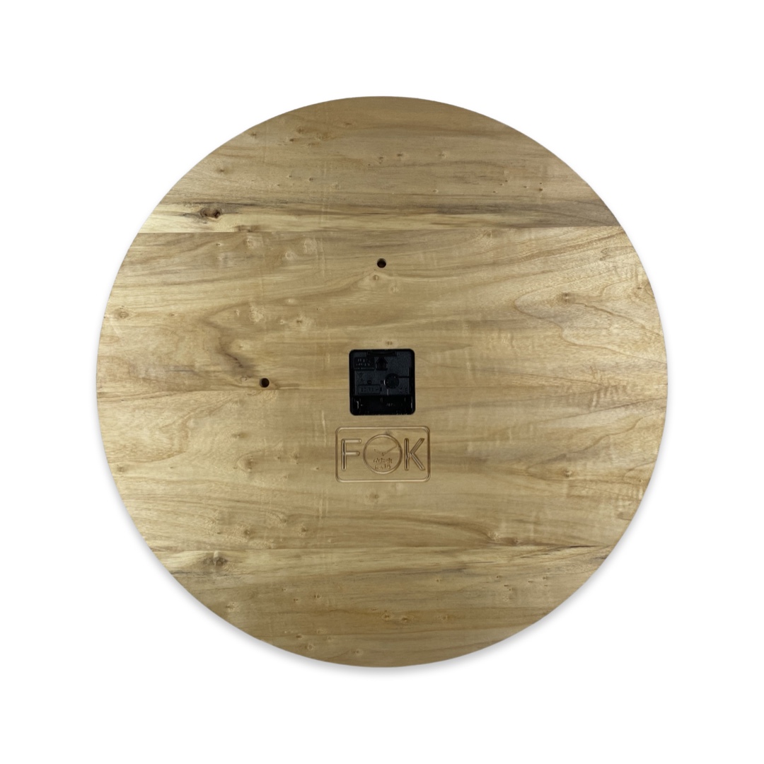 Prachtige wandklok gemaakt van zilver Iep. Oorsprong van het hout ligt in de gemeente Tynaarlo (Drenthe). Uit het verlijmde paneel konden twee klokken gefreesd worden. Deze klok combineert het bijna spiegel glad geschuurde lichte hout van de iep met een geborstelde koperen ronde inleg waarmee de uren worden aangeduid.