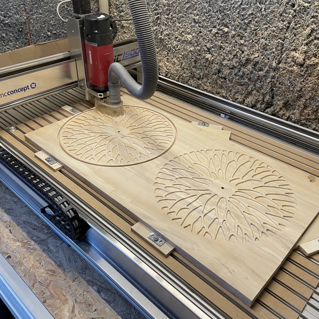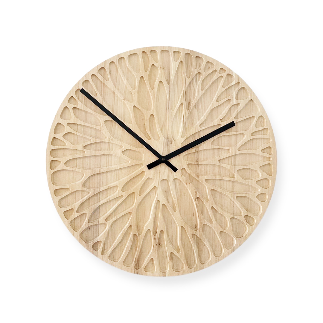 Prachtige wandklok gemaakt van zilver Iep. Oorsprong van het hout ligt in de gemeente Tynaarlo (Drenthe). Uit het verlijmde paneel kon ik twee grote klokken frezen met beide een organisch ontwerp. Door de unieke lijnen in het hout hebben de klokken een eigen uitstraling. De organische vormen hebben zich vertaald naar een ontwerp die ik passend vond voor deze klok. Het speelse effect van de dynamische lijnen blijft intrigerend om naar te kijken.