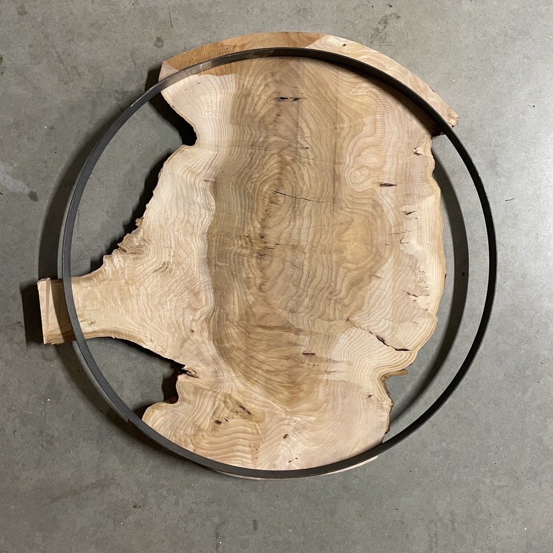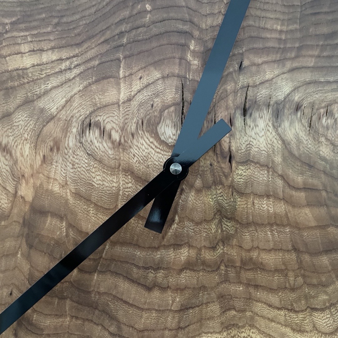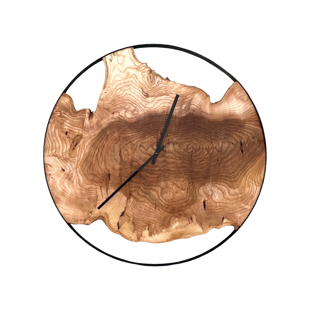 Grote wandklok gemaakt van een Burl van Iep met stalen ring. Wat deze klok uniek maakt is de Burl. Deze hebben een eigenaardige en een karakteristieke houtstructuur. Doordat het draad misvormt is kan het snel uitbreken. Zo zie je zowel horizontaal als verticaal op het hout de groeiringen. Het hout is daardoor redelijk moeilijk te bewerken omdat het gauw krom trekt. Ook uniek is de stalen ring die door Hans, van Las en Montagebedrijf Horlings, met de hand perfect rond is gewalst. De prachtige tekening in het hout komt door de afwerking met Rubio Monocoat mooi naar voren.