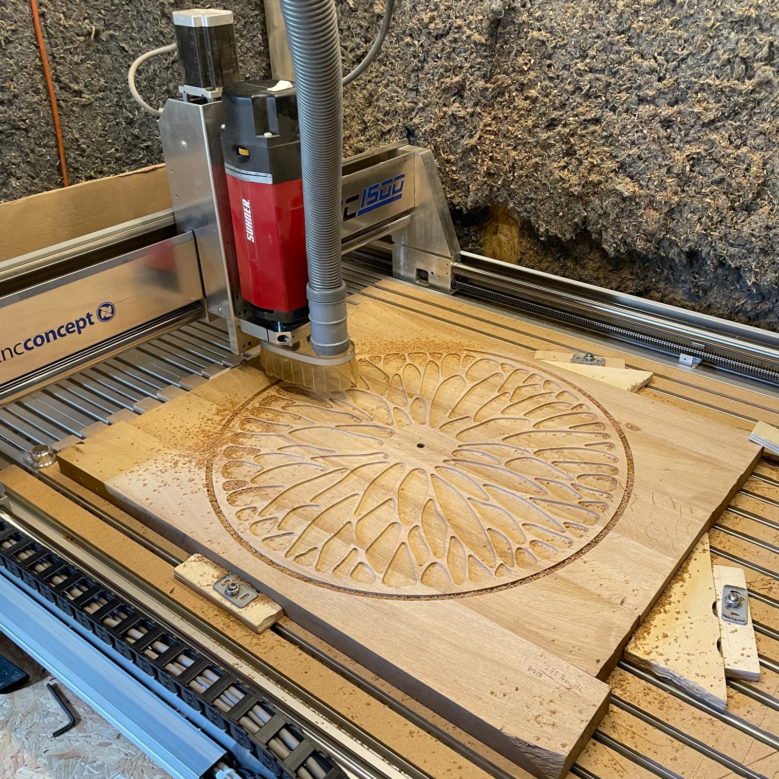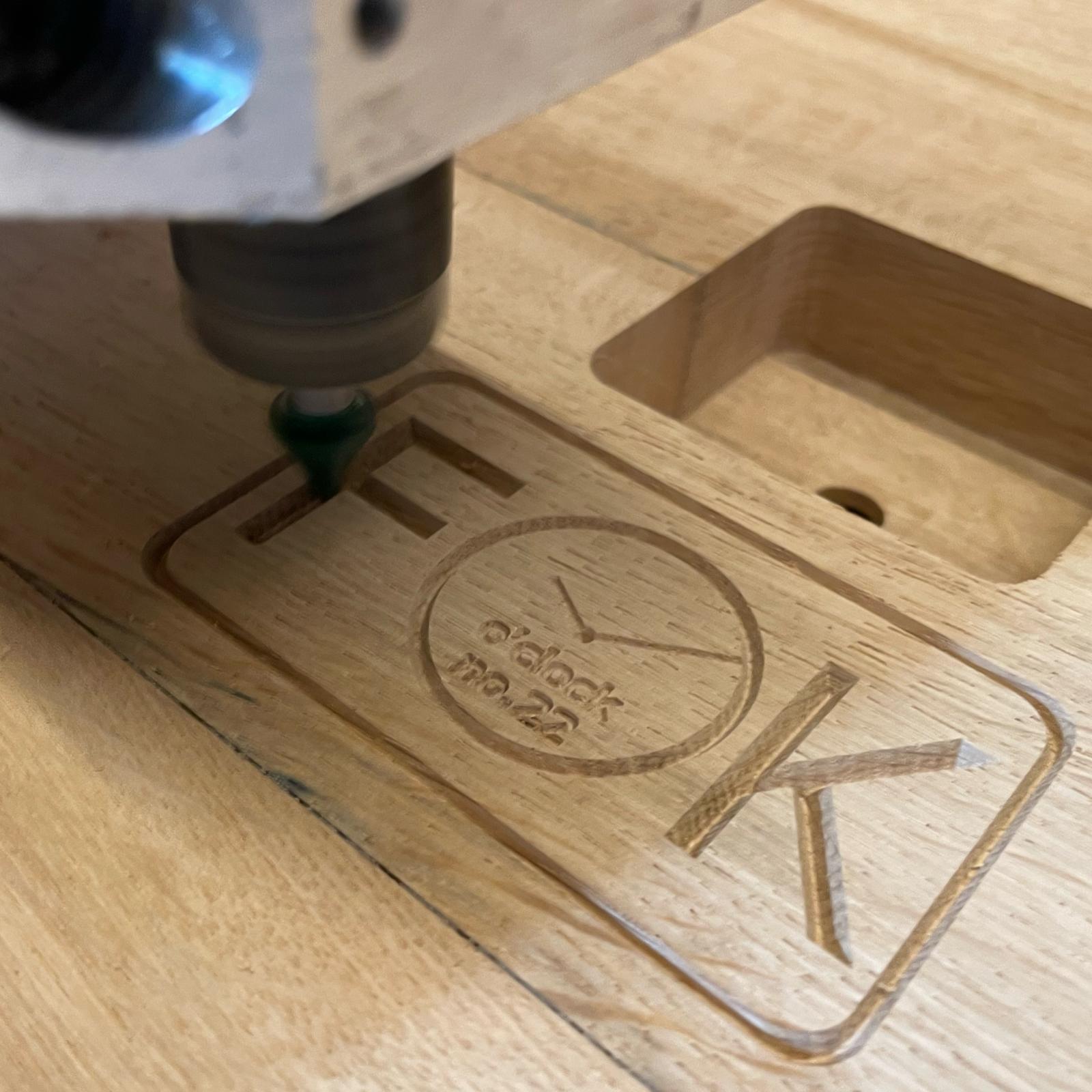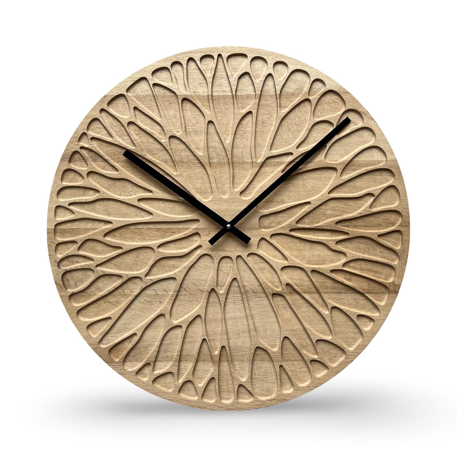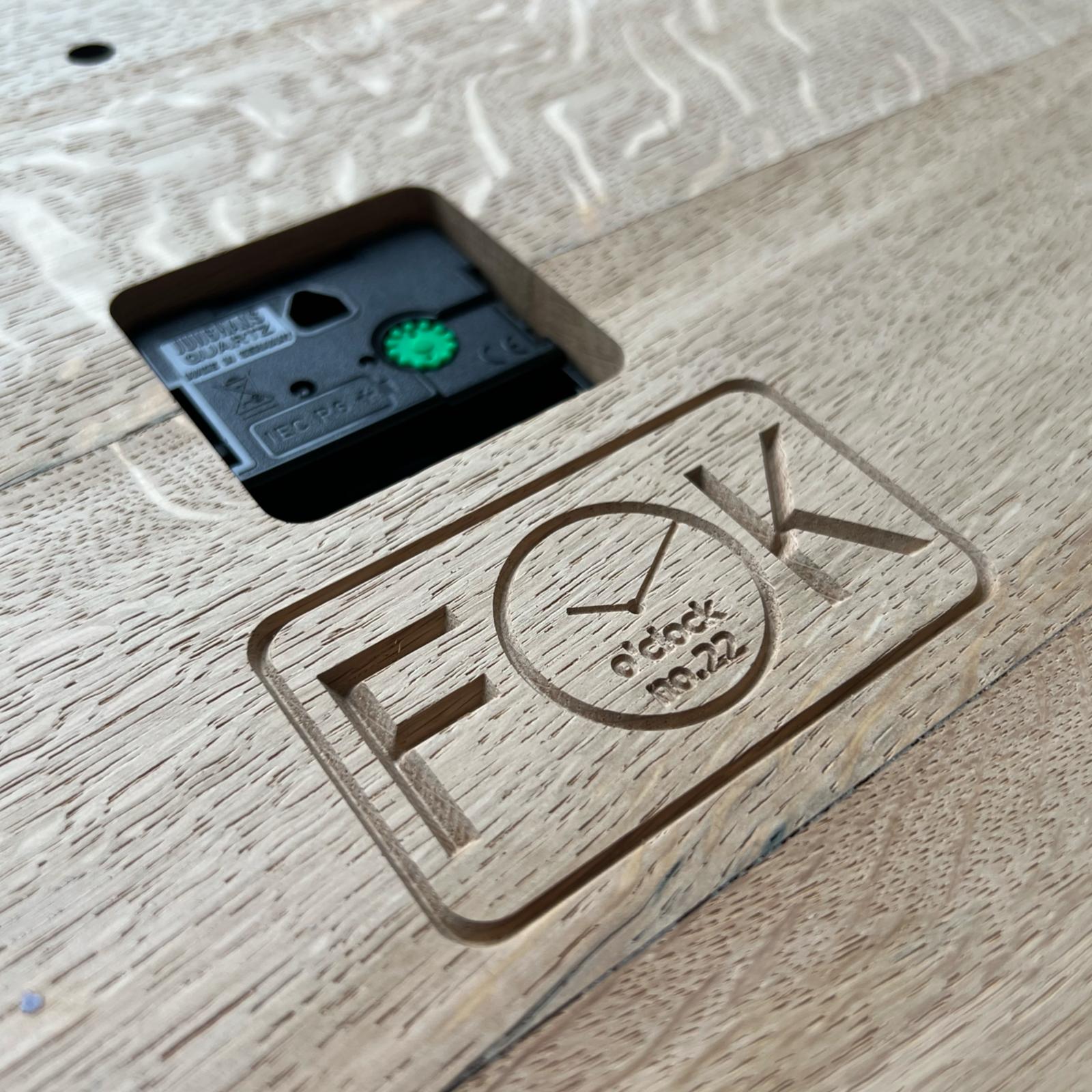 Prachtige wandklok gemaakt van Europees Eik. Oorsprong van het hout ligt in de gemeente Tynaarlo (Drenthe). Uit het verlijmde paneel kon deze mooie grote klok gefreesd worden met een organisch ontwerp. Door de unieke lijnen in het hout heeft de klok een eigen uitstraling. De organische vormen hebben zich vertaald naar een ontwerp die ik passend vond voor deze klok. Het speelse effect van de dynamische lijnen blijft intrigerend om naar te kijken. Door de twee ophangpunten achterop de klok, kan zelf bepaald worden hoe de lijnen van het hout het beste tot zijn recht komen op de plek waar hij komt te hangen.